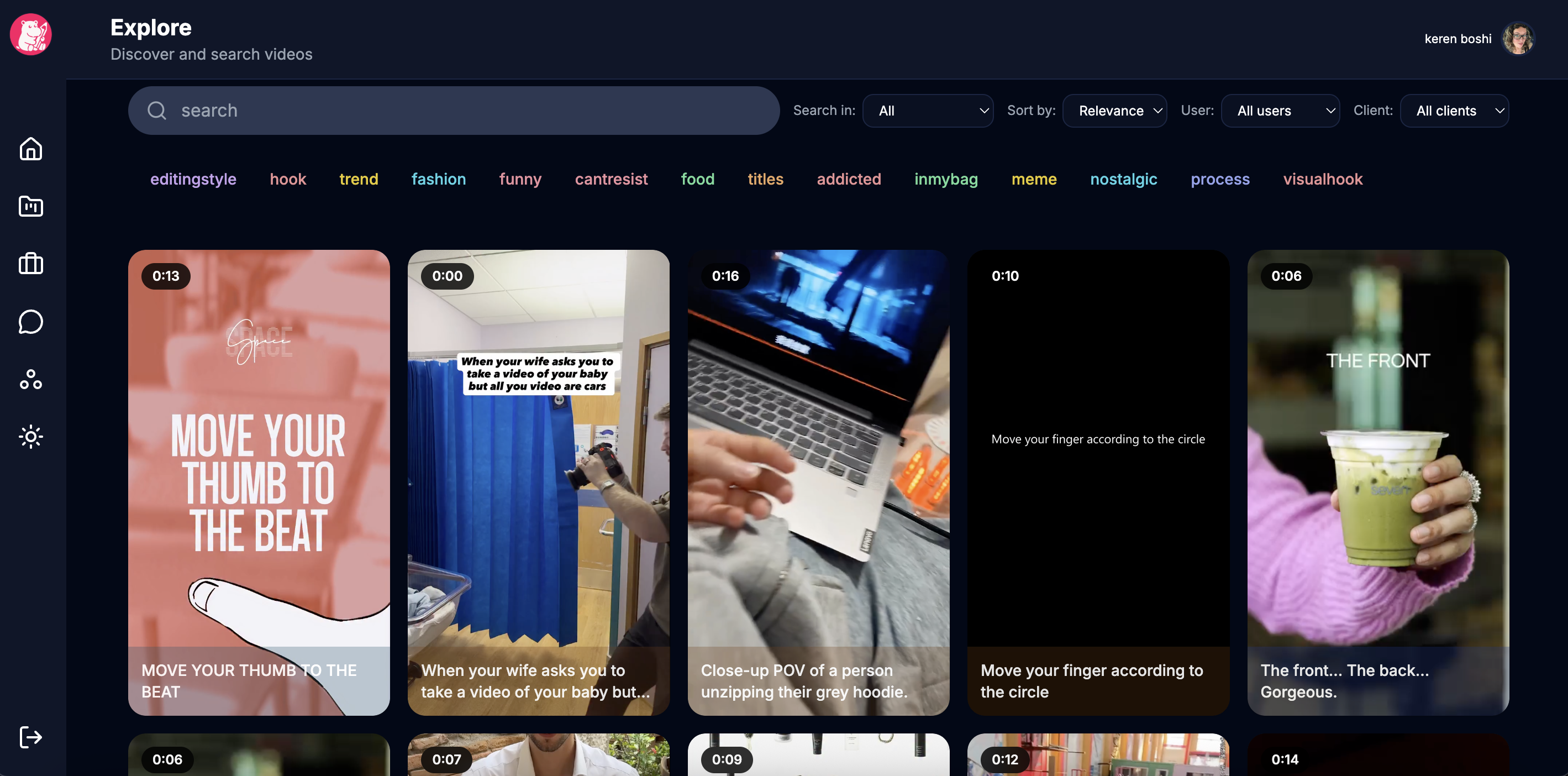 A shared workspace where you and your team can browse every saved reference. Each video is analyzed and searchable by client, tags, or free search - including queries like “face,” with results based on what’s seen, said, or contextually related.