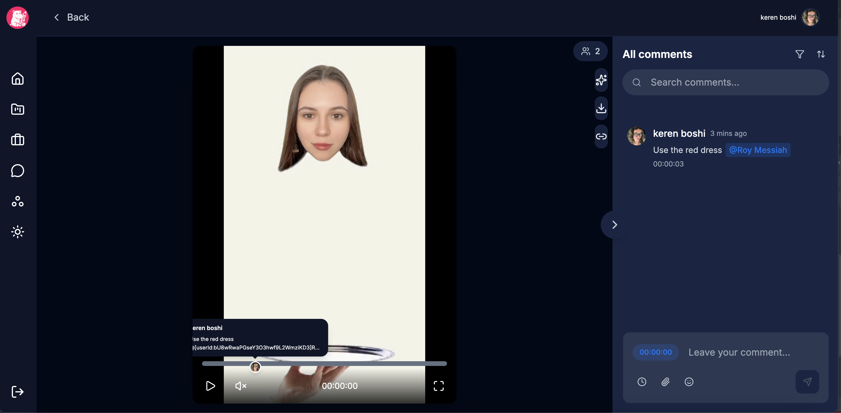 A dedicated page for each reference video with timeline comments, second-by-second notes, and teammate tagging - built for fast reviews and shared decisions.
