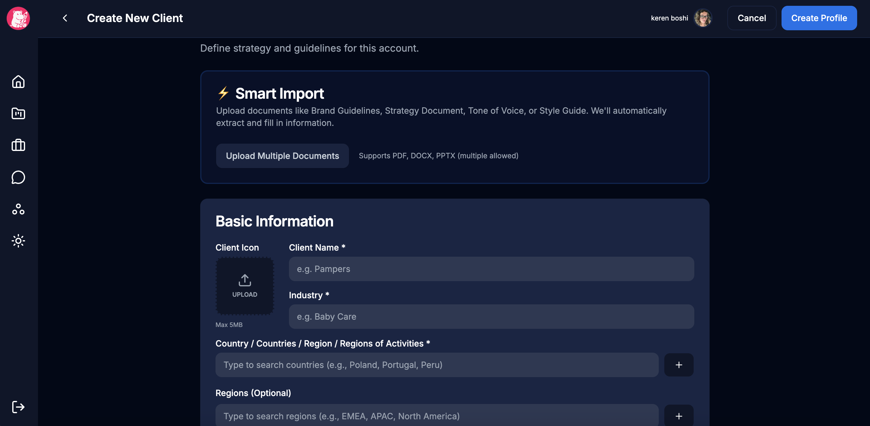 Upload brand docs (tone of voice, brand book, values, etc.) and Scrippo extracts key information to pre-fill the client profile. Add a brief to create a project, and the tool matches client + brief to generate more relevant scripts.