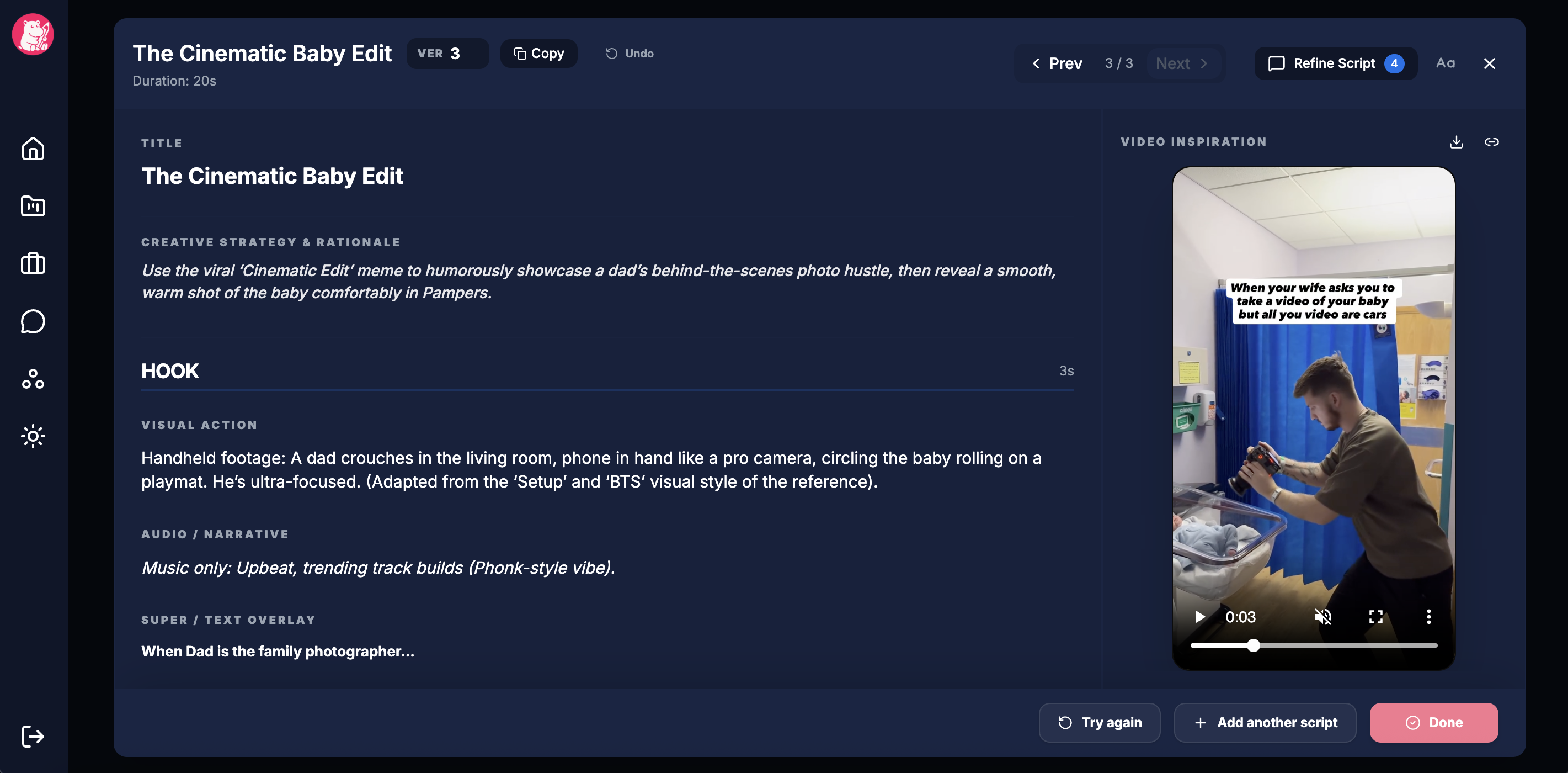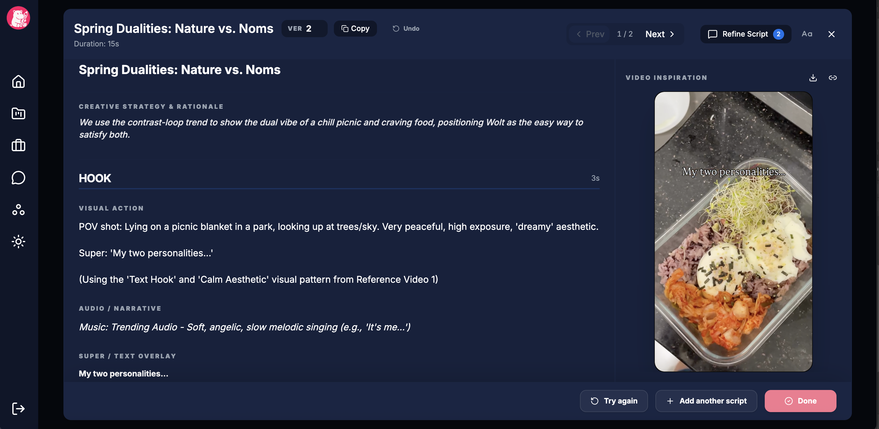 Refine the script inside the tool - adjust tone, pacing, structure, or angles - while keeping the reference video as the anchor.